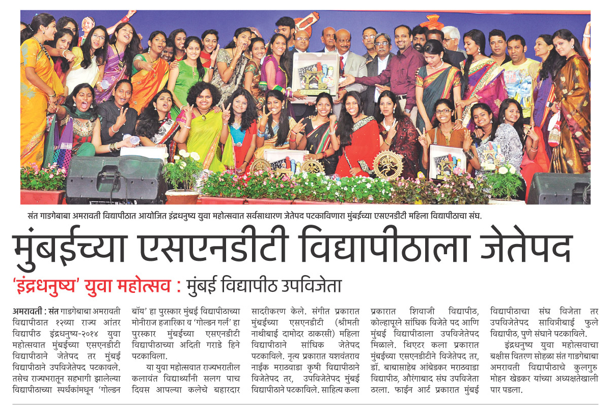 SNDT Women's University won Overall Runner up Trophy of 30th West Zone Inter University Youth Festival 2014 held at Ajmer.